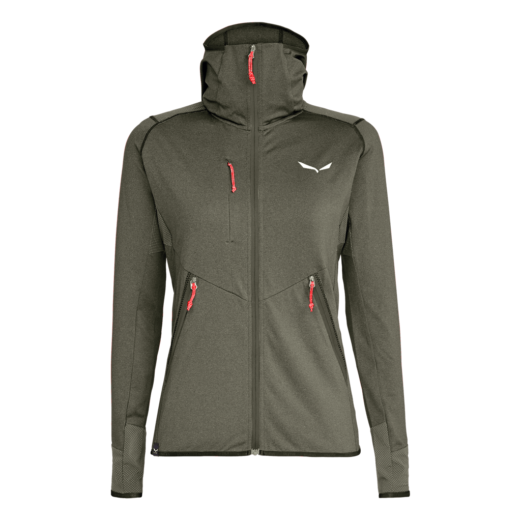 A lightweight, women’s hybrid technical fleece hoodie with rock-resistant Durastretch inserts for alpine climbing and summer mountaineering.