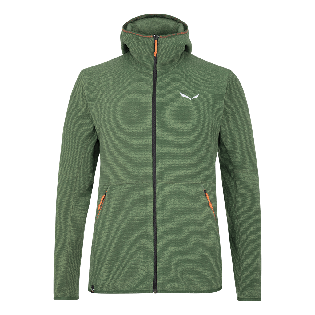Eine warme, atmungsaktive Fleecejacke mit Kapuze zum alpinen Trekking oder Schneeschuhwandern.