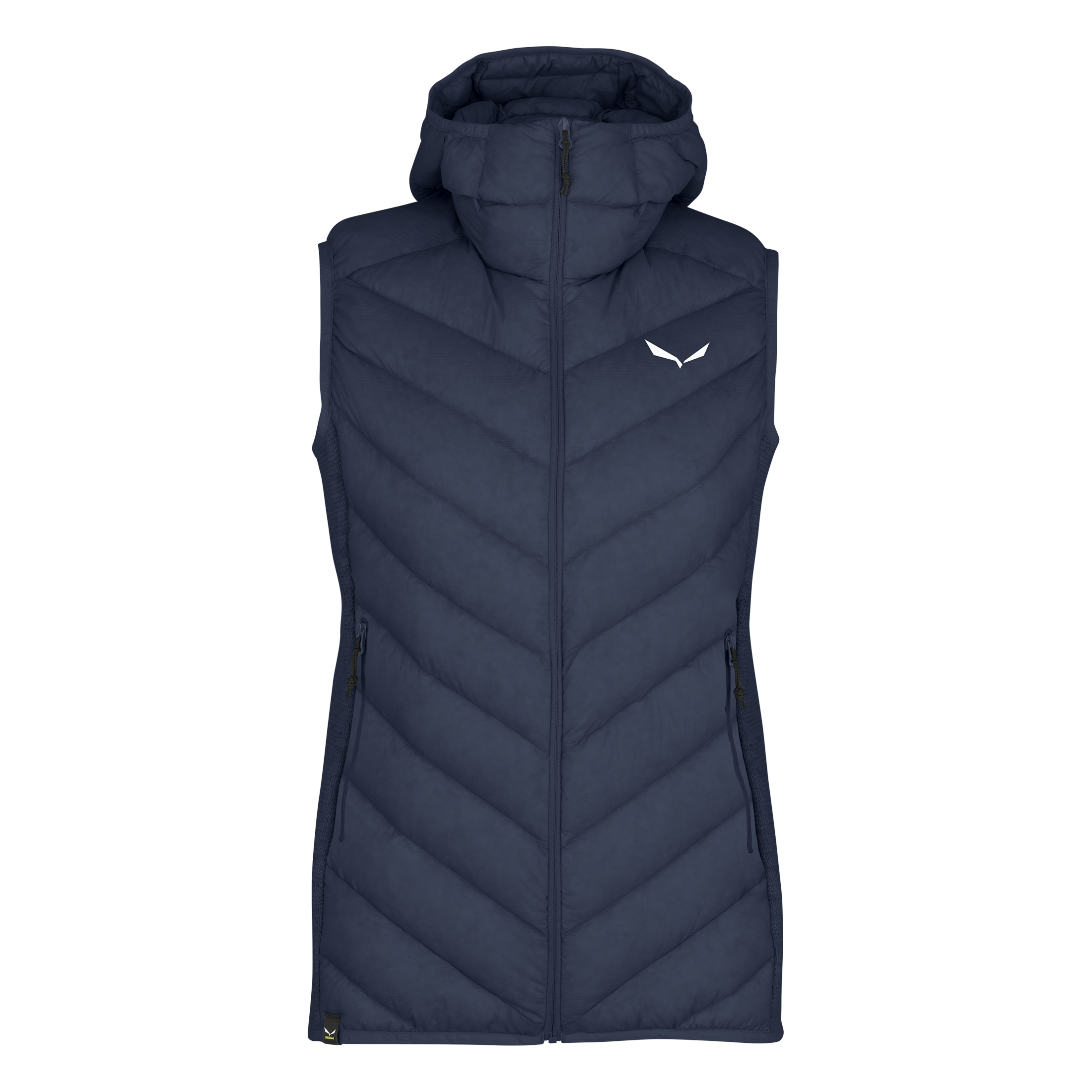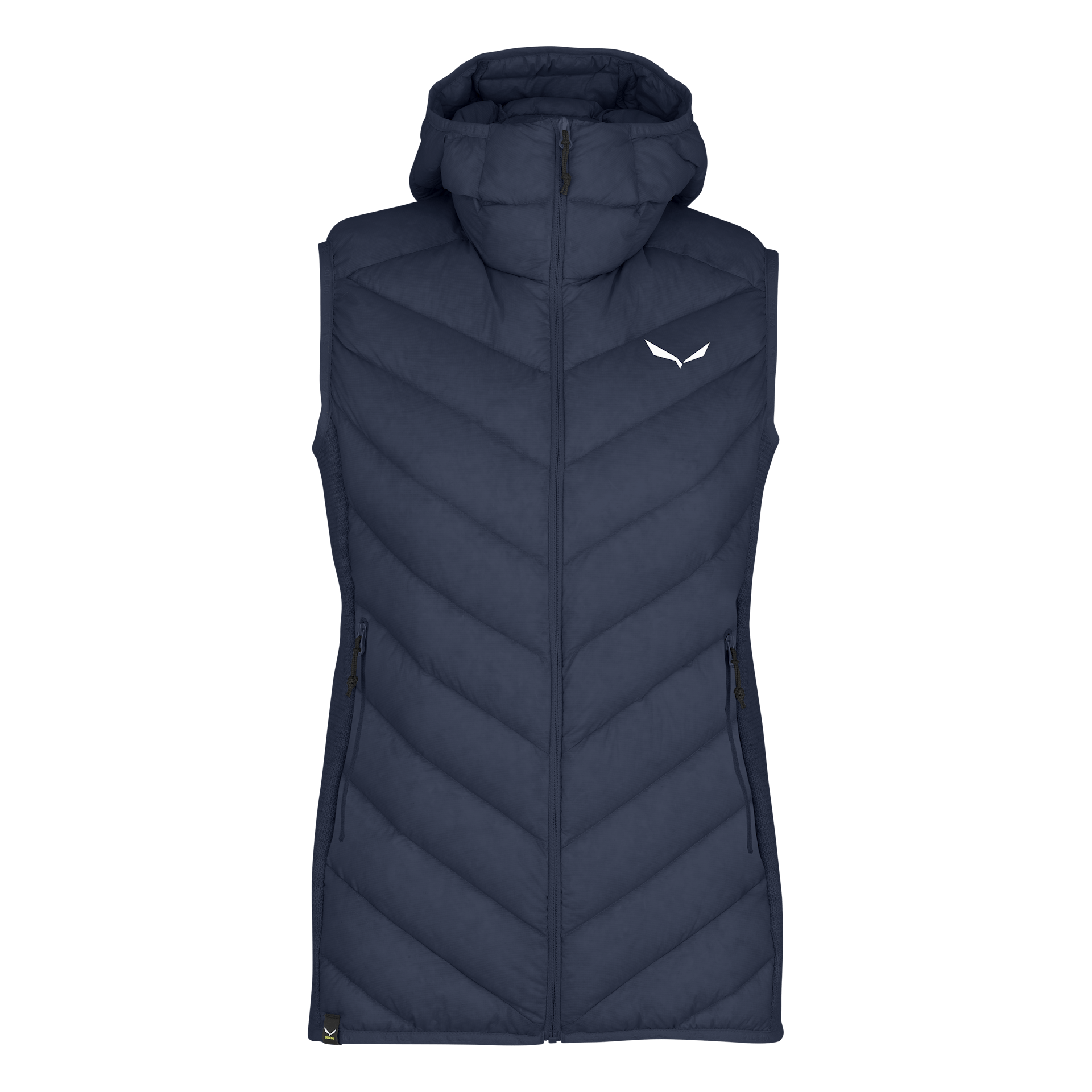 Eine Hybrid-Daunenweste für Damen mit wollenen Stretch-Einsätzen in stylischem Sarner-Strickmuster, die an kalten Tagen für zusätzliche Wärme sorgen – sowohl in den Bergen als auch in der Stadt.