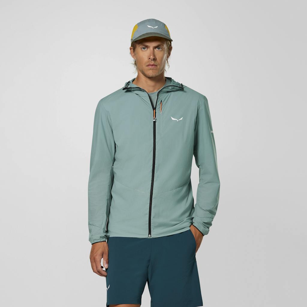 A lightweight breathable windbreaker for fast-moving mountain activity in variable conditions, packs away into its own chest pocket. The lightweight, ripstop fabric has a PFAS-free DWR finish to resist light rain, and a rear wicking mesh insert.